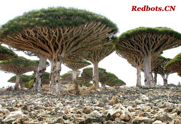 我们先从龙血树开始说起,这种树是提炼清漆、染料和“百宝丹”药物的珍贵树脂的来源,中世纪的巫术仪式和炼金术中也使用这种东西。龙血树的枝干伸向天空,从下面看,它上面就像有很多盘旋飞行的飞碟,从上方看,它显然像一个大大的蘑菇。