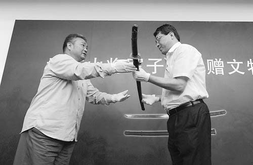 7月6日,著名抗日将领孟庆山将军子女在北京将珍藏多年、其父于1938年2月攻打河间县城作战中缴获的日军军刀捐献给抗日战争纪念馆。 李木易摄