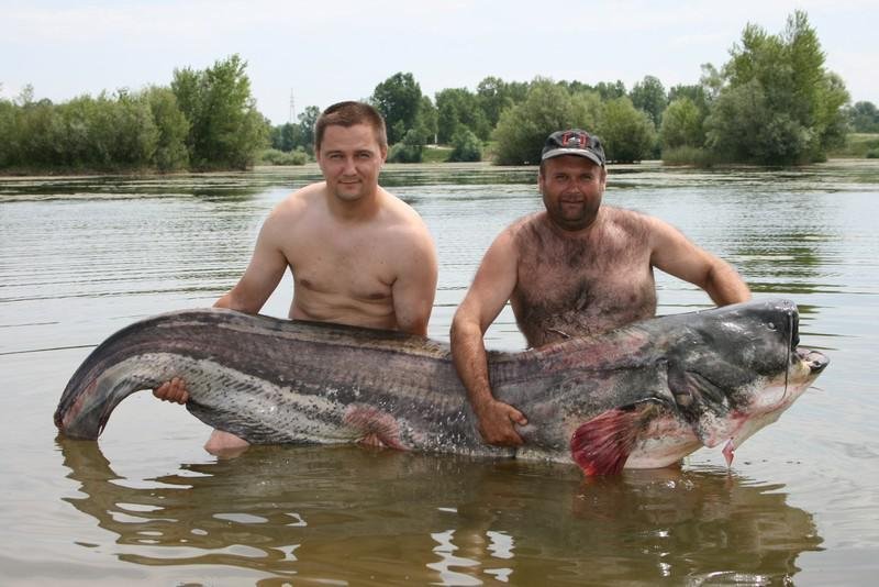 好大一条鱼---90公斤重。克罗地亚两鱼夫逮到一条2.5米长,90公斤重的大鲢鱼。