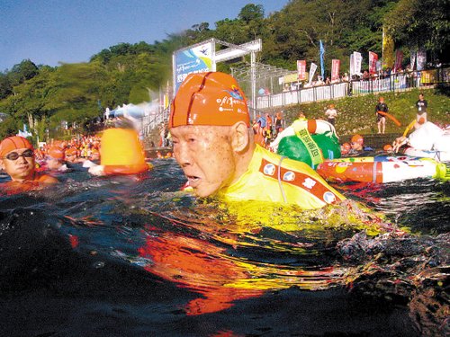 1 J1 c0 b: W, y2 ?& q" J% n0 ^2010年9月12日,我们河南冬泳朋友组成的赴台团队,有幸参加了台湾一年一度的日月潭国际万人泳渡嘉年华活动,今年是第28届泳渡日月潭,参加的人数共有二万七千一百二十三人,创泳渡日月潭举办28年来人数最高纪录。参加的有世界四十个国家的游泳健儿,年龄最大的99岁了,还有很多的身残志不残游泳朋友,凭着他们的毅力游完了横渡日月潭3300米,他们的精神将激励着我们。这次活动庞大无比,声势浩大,震撼人心。$ {) {+ w! e4 S* B+ H