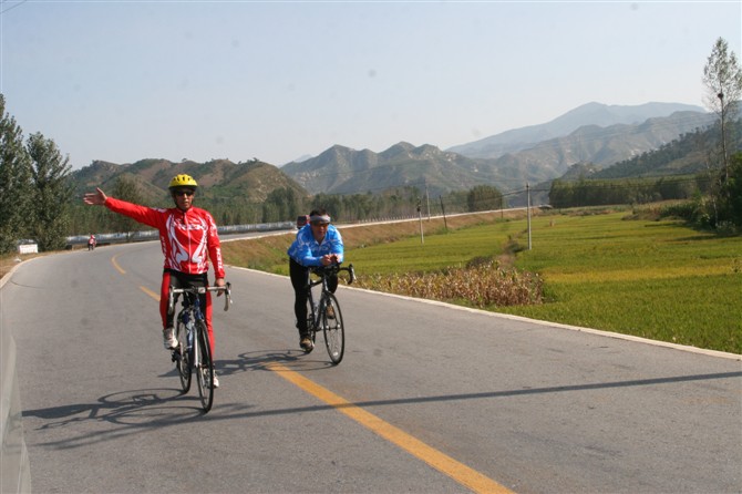 因为山上景点有50多处,这次骑行的时间又非常短,在游完画廊谷之后我们依依不舍的回到旅馆收拾行囊准备归程。相比于来时,回去的路途就要平坦得多,下坡也比较多,大家说说笑笑,不知道不觉就到了干沟岭下。说起这个干沟岭可不寻常,它是一段长达20公里的上坡路!正是考虑到我们回程的难度,大家针对干沟岭骑行制定出了正确的对策,8人分成2组,每组始终有一人领骑,以减弱后边成员骑行过程中的阻力....就这样,在大家的团结协作下,长达20公里的干沟岭也被我们甩在了身后,更值得一提的是,在上岭的过程中没有一人下车歇息,不管是53岁的骑山地的刘大爷还是骑公路的程哥姚哥和强哥,大家硬是依靠顽强的毅力笑到了最后。