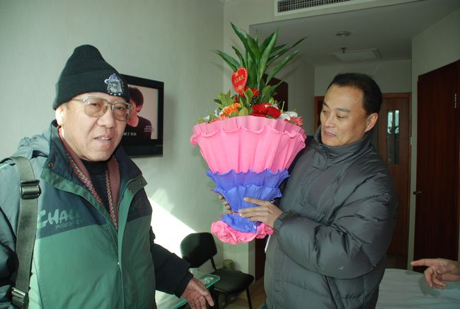 昨天我接到天津冬泳专区年轻人的电话,称明天也就是1月16号要来郑州办事,事办完后帮助联系游泳的事,至于办什么事我也不好意思多问,我非常爽快的答应了。今天上午我又和年轻人联系上了,原来他们是在参加襄阳举行的横渡汉江活动后从襄阳乘火车来,夜里三点下的火车,接连找了几个酒店都没有床位了,好不容易在一个宾馆找到住的地方,等到休息的时候已经很晚了。一大早就有起来定制鲜花,购买礼品原来是看望一个普通泳友、普通版主刘娃娃的父亲。刘娃娃的父亲已经92岁了,由于年老多病,在郑州住院。作为泳友听说以后,在这寒冷的冬季, 春运已经开始,乘坐火车的人员非常多的情况下,毅然在夜里三点下火车决定看望老人。尊敬老人,大爱无疆,是我们中华民族的优良传统。年轻人、子牙河老韩作为普通泳友,把泳友的老人当成自己老人一样孝敬,其精神是多么的难能可贵!我真被他们的精神所感动!
