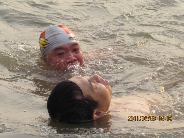 初六安阳的冬泳队员们搞水上救生表演很精采并且当场讲解和演练