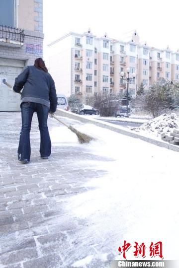 小区清洁人员在清扫积雪。 李鸿劼 摄