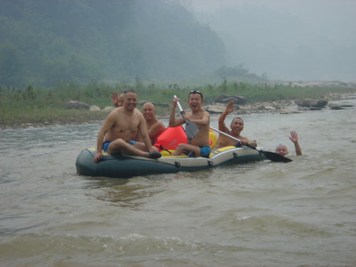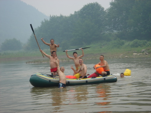 上午9时,队员们冒着小雨,分乘三艘橡皮艇,从三台县古井镇新妙渡口下水,往三台方向漂流。凯江是三台县境内的第二大河流,此次是首次漂流凯江,队员们对沿途激流险滩水势不了解,俱乐部准备了三般橡皮艇以防不泽,由于橡皮艇承载人员有限,队员们采取轮流下河游泳,轮流上艇划水的方式漂流。由于凯江水流遇浅则急,遇深则缓,一路上,很多队员腿部被浅滩乱石划伤,在深水区则需强魄的耐力奋力游过“死水潭”。一路上,队员们相互配合,以玩强的毅力冲过了层层激流险滩。而沿途植被茂密,河边怪石嶙嶙。如画的风景,又使漂流队员们陶醉其中。