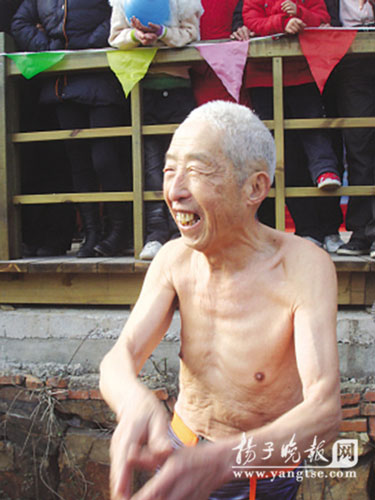 据悉,本次活动是20年来苏州冬泳爱好者首次在冬泳日到户外举办大规模活动。记者发现,200多名参赛者八成以上是老年人,80岁以上高龄的就有5位,其中还有一对老红军伉俪,84岁的邱协耕和81岁的吉利曾参加过渡江战役,邱老坚持游泳70年,冬泳泳龄也已经20多年了。陶德麒老人是参加本次活动中年纪最大的,今年已经89岁高龄。别看他瘦小,老人在水中可是如鱼得水。提起冬泳,老人显得很高兴。他告诉记者,他已经坚持了30年,不管天气多冷,一直坚持每天都游泳,身体很健康。当护士的老伴也很支持他的爱好。“30年如一日就这样坚持下来了!平时小毛小病都没有的!”老人笑言,现在很多人害怕甲流,可甲流却害怕冬泳人,因为坚持冬泳的人抵抗力都很好。
