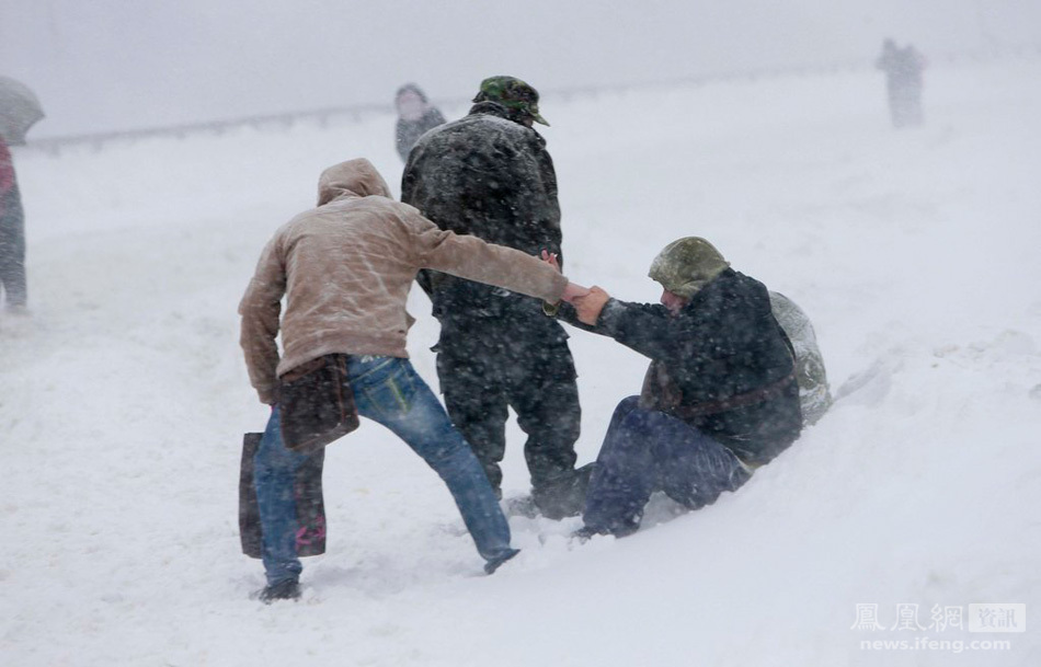 110国道上的被困者,从4日中午开始,吃上了附近村民送来的泡面和开水。4日下午4点30分,延庆县井庄镇北地村,响起了轰隆隆的铲雪车声。天逐渐转黑,北京养护集团的工人下车,在夜幕中和民警一道参与铁锹铲雪。4日晚6时许,停滞22个多小时后,司机们重新踏上回家的路。24小时内,高速上的被困者得到营救。图为11月4日,一名走不动的被困者被同伴拉起。秦斌 摄