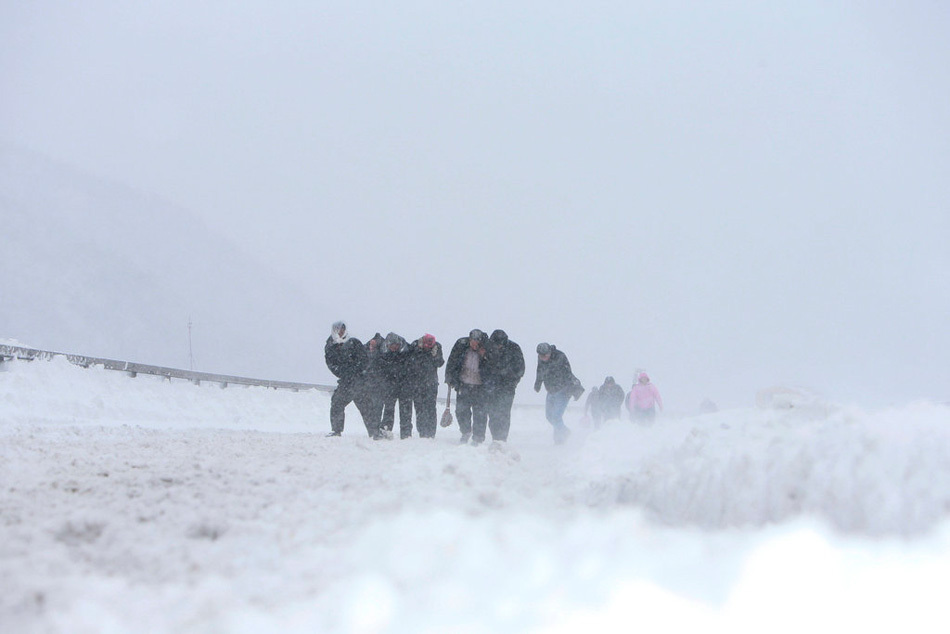 2012年11月3日晚7时,近两千人被困在北京八达岭高速出京居庸关到水关长城段。几乎是同一时间,110国道昌平区和延庆县交界处,至少1000辆车误在风雪里。图为11月4日,被困者徒步十余公里走向营救集结点。秦斌 摄