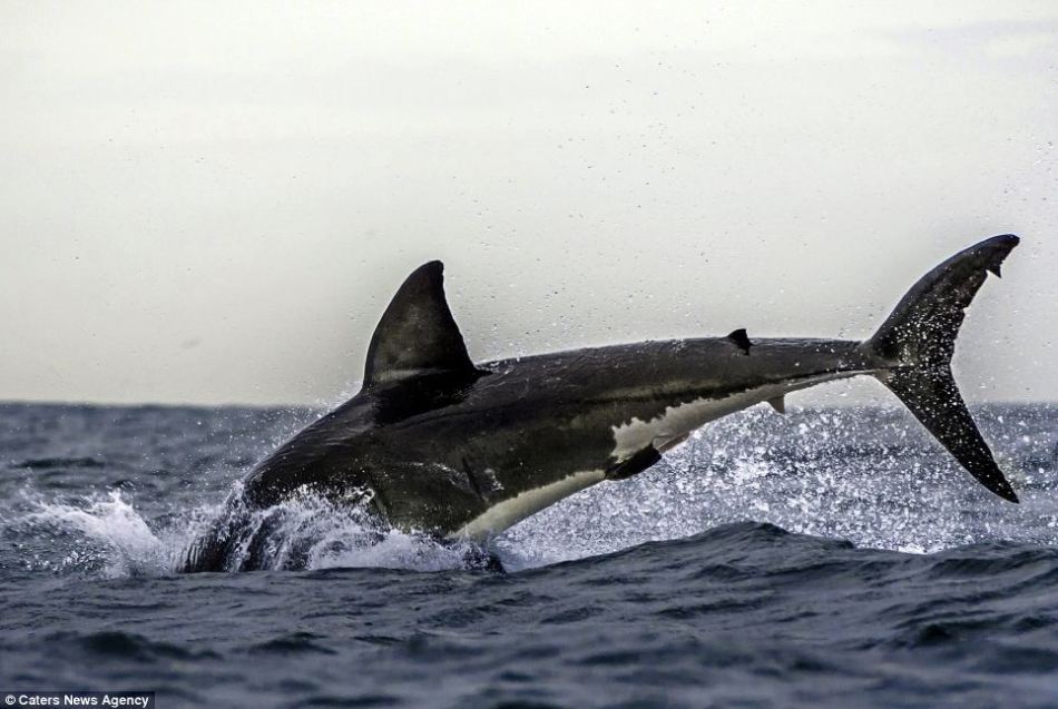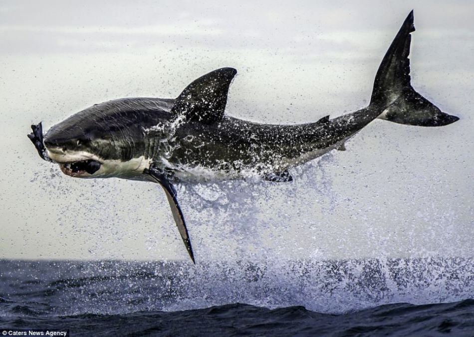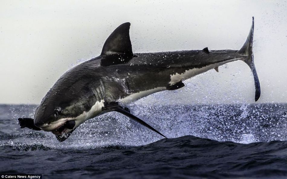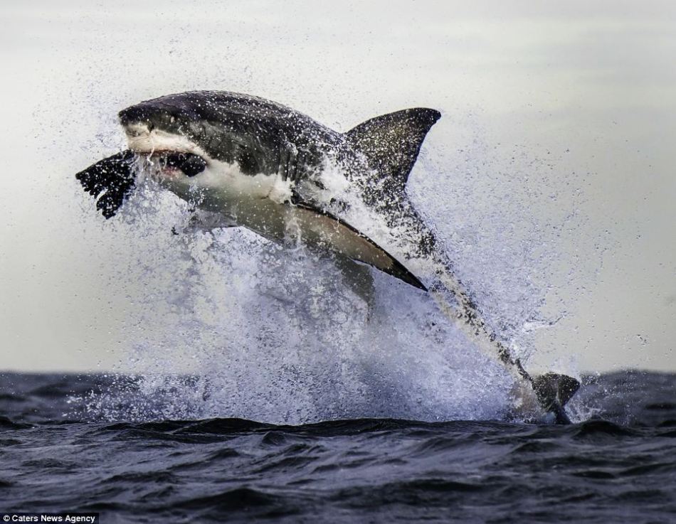 这张令人惊叹的照片捕捉到一头大白鲨嘴里含着海豹跃出水面的惊人瞬间,照片是50岁摄影师戴纳-艾伦在南非开普敦福尔斯湾拍摄的。艾伦的工作组利用一只橡胶“诱饵”海豹引诱大白鲨,经过3天的不懈努力才设法捕捉到这些令人惊异的画面。