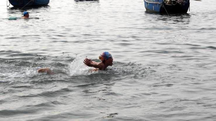 摇水井海泳队今天对队员的学习进行测验,检查队员的技术水平提高情况。