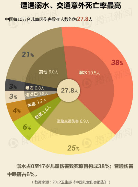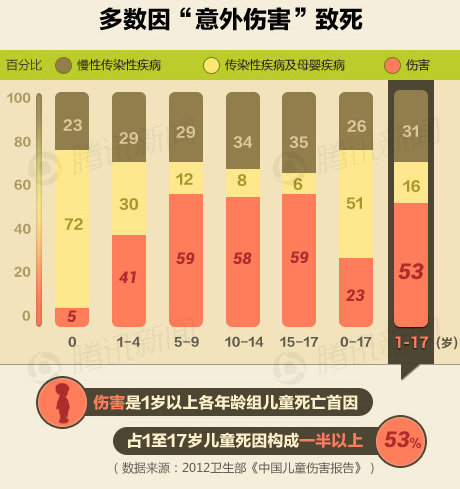 其中0-17岁的死亡构成原因中,23%是因为意外伤害;而1-17岁的儿童中,这个比例高达53%。