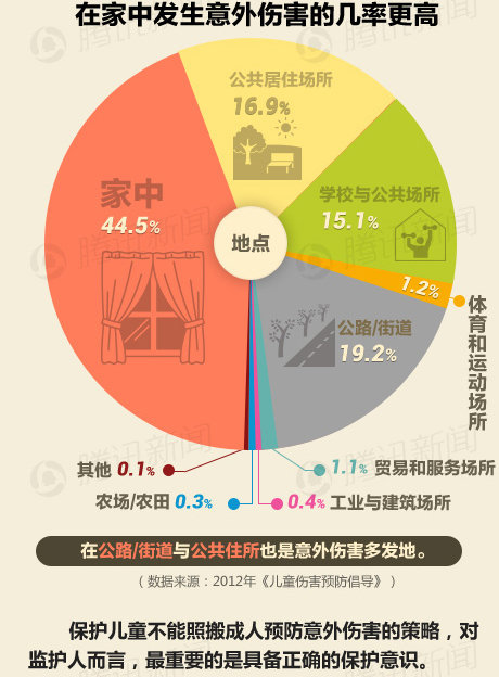 在伤害发生地点方面,“家中”几率最高,达到44.5%,远高于其它场所