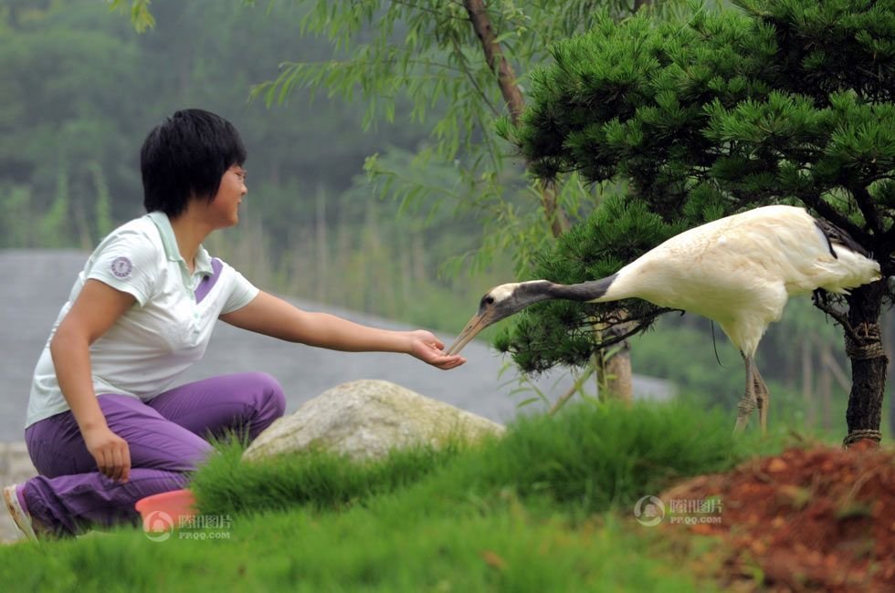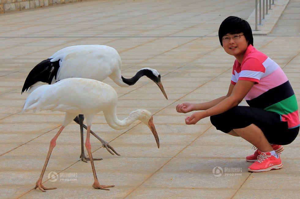 白鹤及丹顶鹤是邹进莲最要好的朋友,喂食时,它们会主动凑过来。