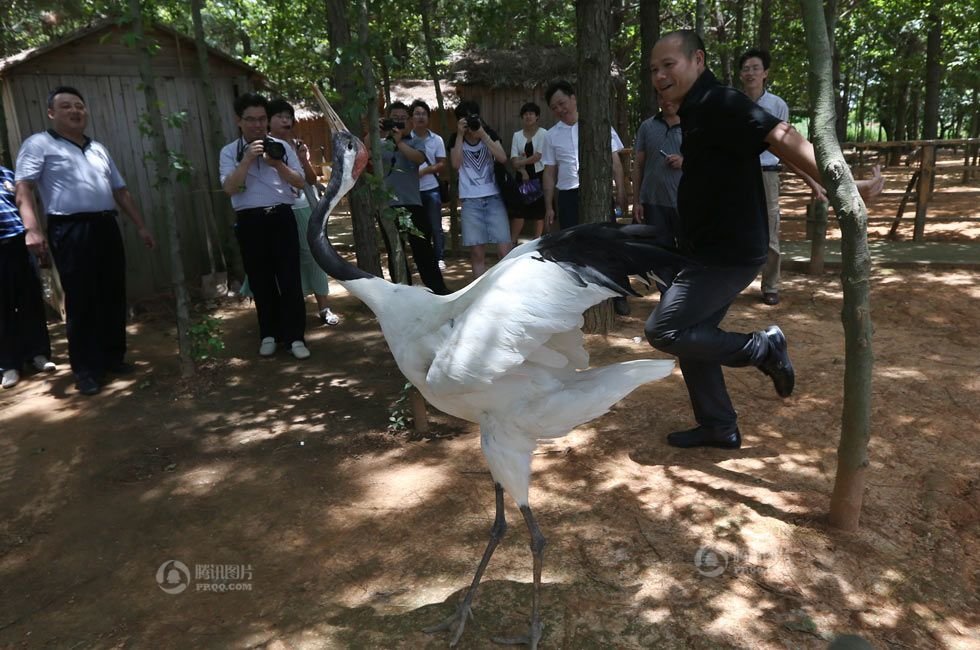 在邹进莲的训练下,优雅的鹤们有了灵性,经常随着游客翩翩起舞。