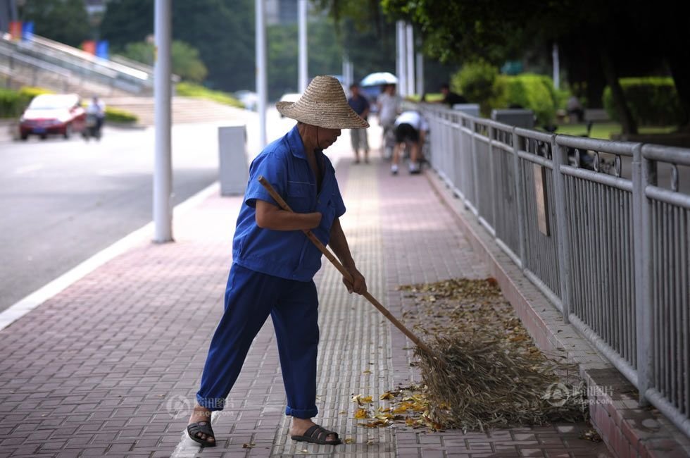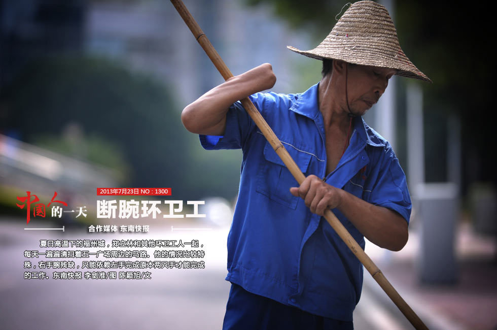 夏日高温下的福州城,郑立林和其它环卫工人一起,每天一遍遍清扫着五一广场周边的马路。他的情况比较特殊,右手腕残缺,只能依赖左手完成原本两只手才能完成的工作。