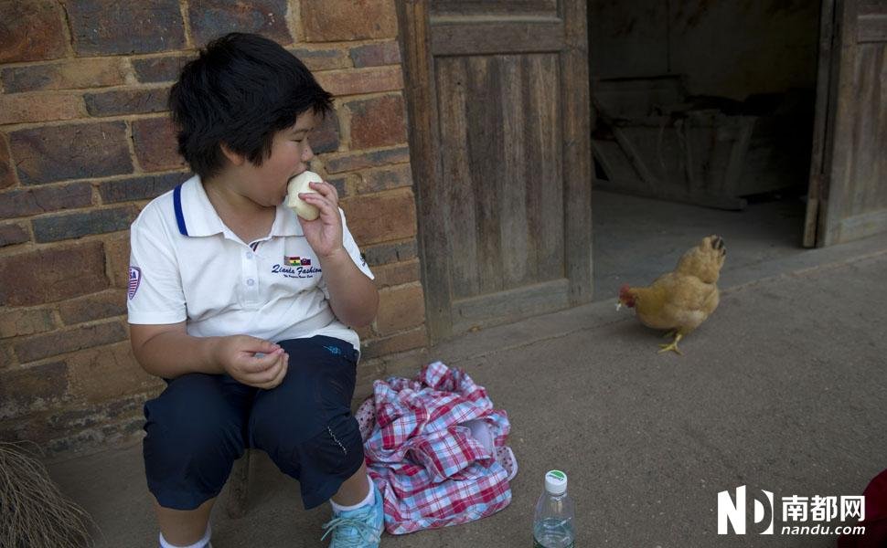 8月4日上午11:34,在路边人家门口坐了十多分钟小宝才缓过神来,才终于肯接过爸爸准备的面包,看到一只母鸡走过来还有兴趣分了块面包给母鸡吃。