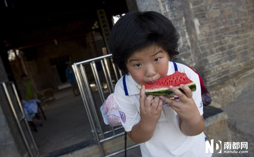 不过,在一次朋友亲子聚会上,曾先生开始发现女儿的不同。在场三个同龄孩子,一个非常聪明,但十分捣蛋,父母围着他几乎一刻都没安生。还有一个能歌善舞,却十分娇气,遇到不顺心就摆脸色。倒是自己这个女儿,虽然默默无闻,却是个好性子,把玩具拿出来与两个小朋友分享,像一个细心的小管家。图为小宝抱着西瓜大口大口的吃着。