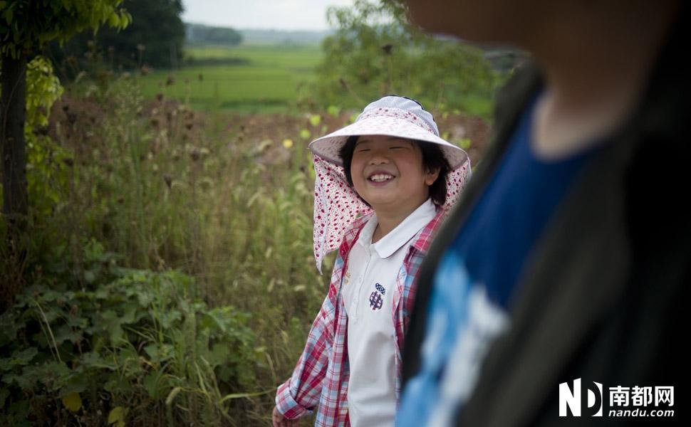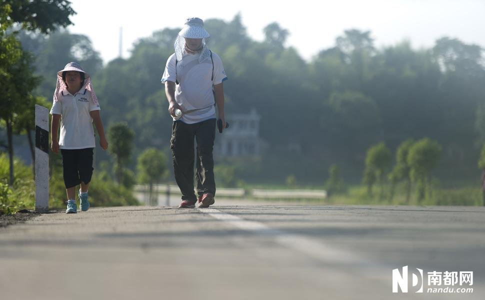 曾子琦在深圳出生,有一个在深圳打拼了20年的老爸,妈妈是全职太太。徒步走回老家的点子,是曾先生的奇思妙想,谁知女儿满口答应。7月13日早晨,曾子琦和妈妈踏上征途。从深圳步行到广州,母女俩用了三天。图为8月3日早上6:51,曾子琦(小宝)一边快步走着一边和爸爸分享着这一路上好玩的事情,说到精彩处她就会笑的眼睛都眯成一条缝。