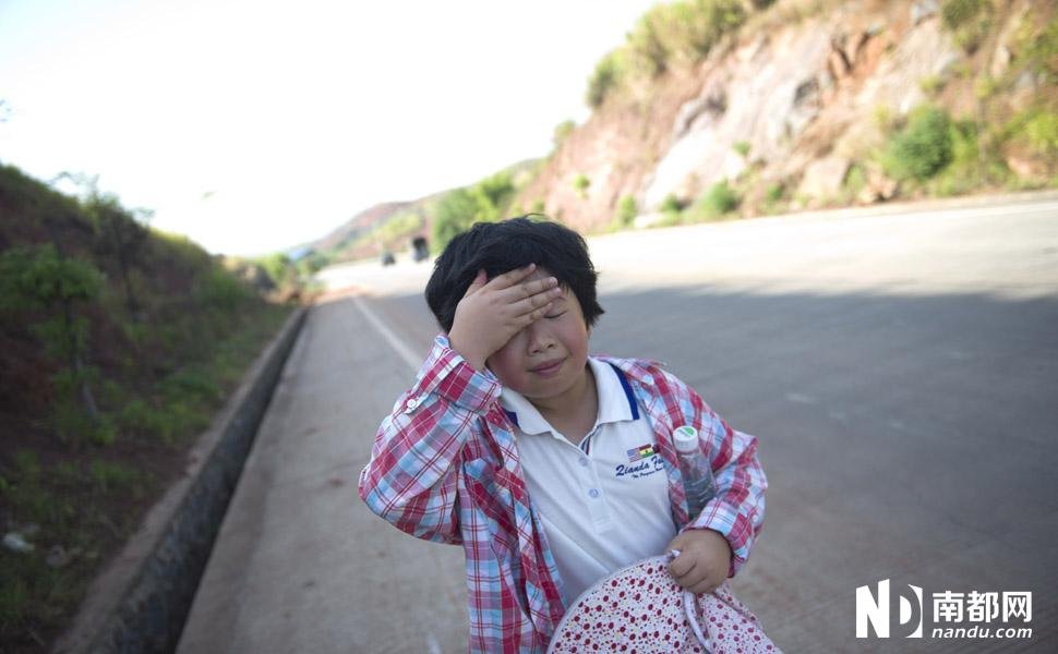 从广州到清远,小宝的新鲜劲也过了大半,耷拉着脑袋,步调从奔跑变成挪动,刘小燕只好用望梅止渴这一招,“到了清远就有好吃的走地鸡了,再往前走一点就到了”。这才让女儿重新提起劲头来。图为8月3日早上7:35,S217往邵阳市方向离邵阳还有112公里,太阳出来了,小宝把妈妈给她买的长袖穿上防止晒伤手臂。