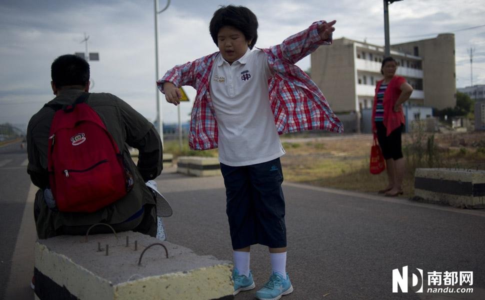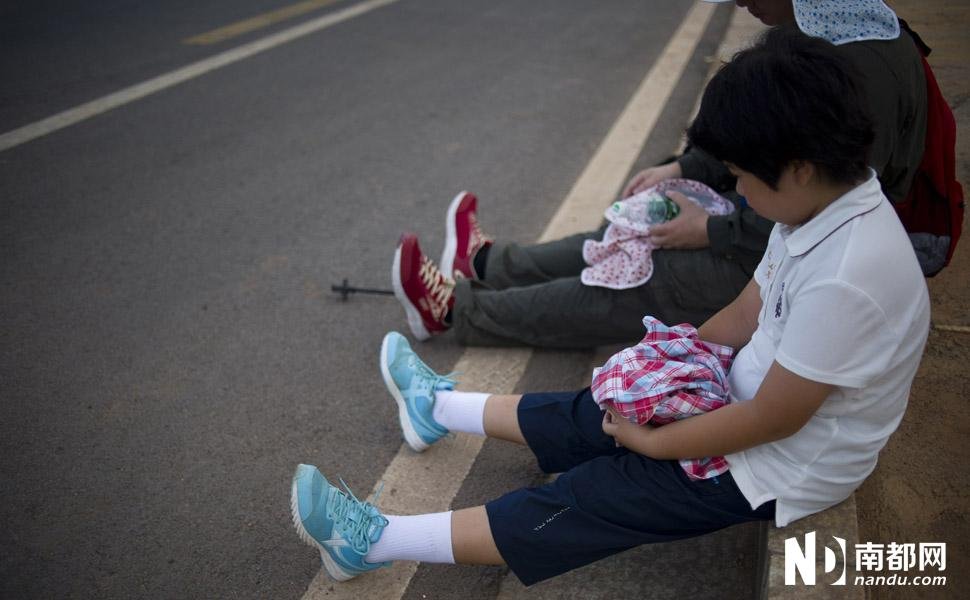 母亲刘小燕原本以为走到广州就能打道回府,谁知道女儿却小嘴一撅———不是说要走到邵阳么,怎么能半途而废。想起平时教育女儿要“有志者事竟成”,刘小燕只好把打道回府的话咽回肚子里。图为8月3日早上6:51,S217往邵阳市方向离邵阳还有115公里,走了近一个半钟,才第一次停下来休息,小宝和爸爸一起放松双腿。