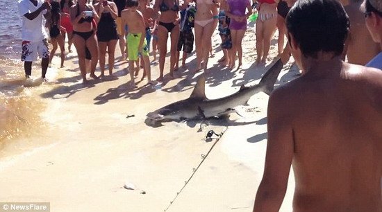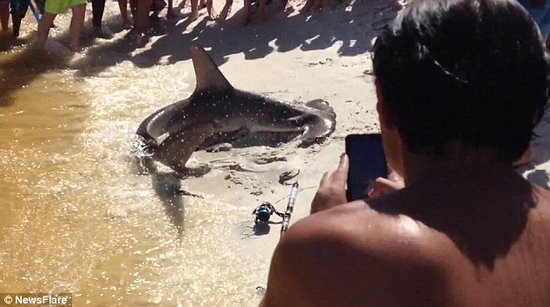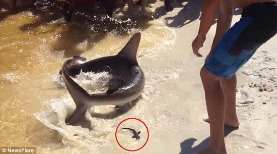 当鲨鱼在海滩上翻滚时,游客们看到刚分娩出来的小鲨鱼