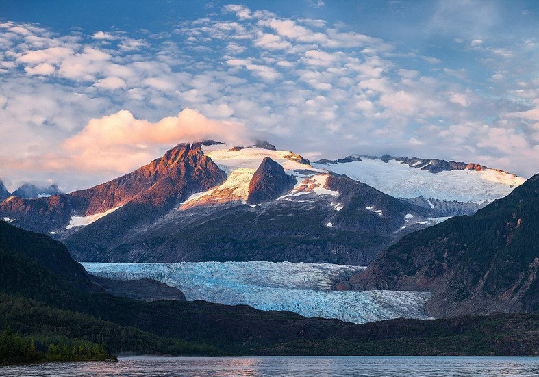 缅田豪冰川长19公里,起源于朱诺冰原,末端位于阿拉斯加州门登霍尔湖边缘。