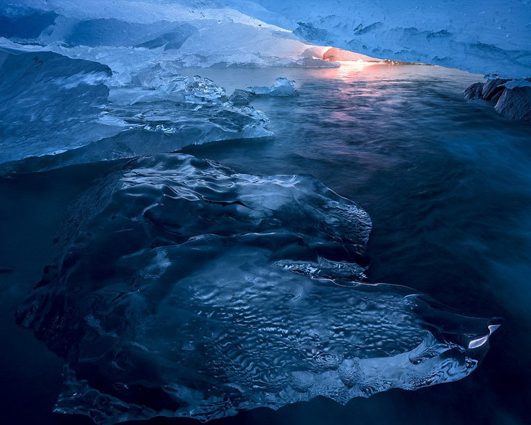 这张照片是日出时分在冰川隧道中拍摄的,呈现出美丽的光线效果。