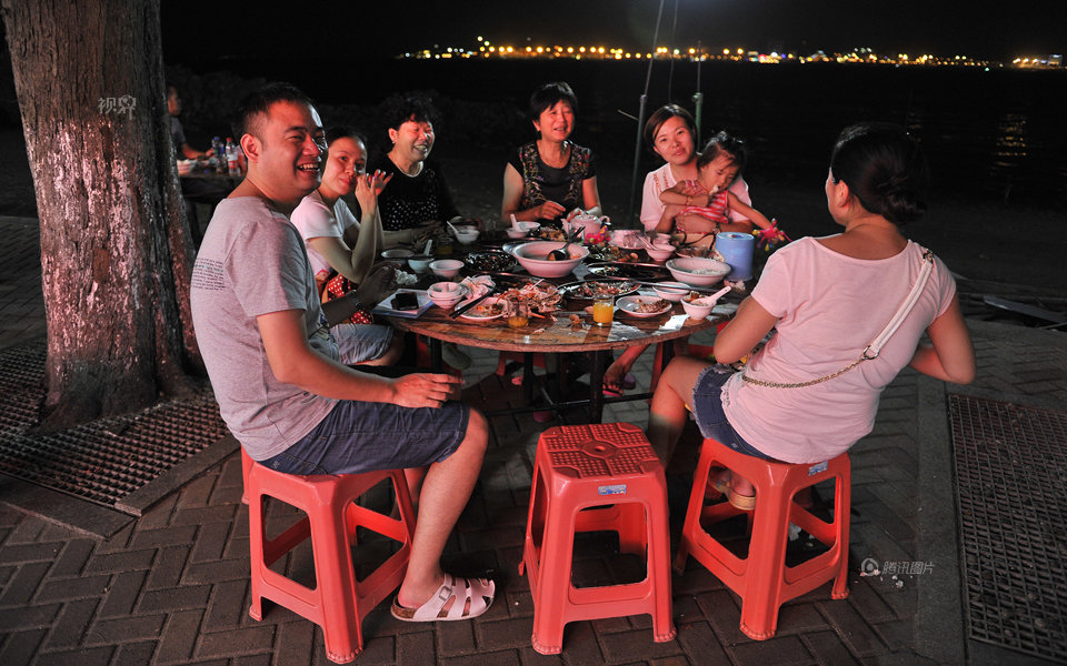 厦门海滩,徐先生(左)和家人,晚餐以海鲜为主。他们家住上海,趁着假期来厦门旅行,在中秋当天到达这里,在海滩上吃“团圆饭”是旅行计划的一部分。