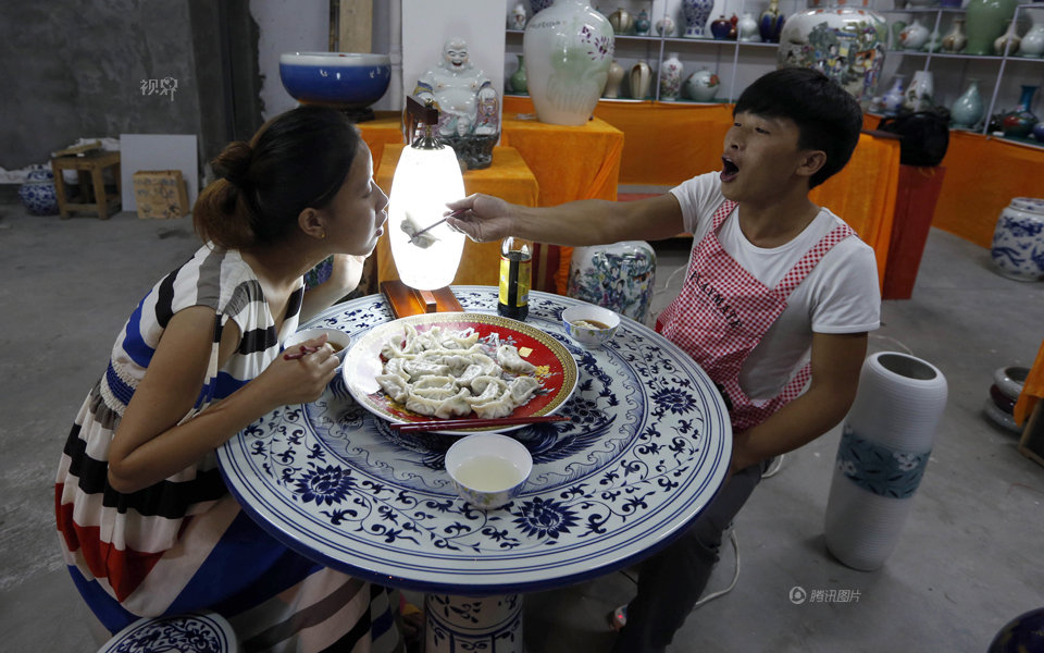 浙江嘉兴一家瓷器工作室,章擎坤和妻子,晚餐是自己包的家乡水饺。他们从江西景德镇到嘉兴来创办瓷器工作室,创业伊始,资金紧张,决定中秋在嘉兴过,不与家人团圆。
