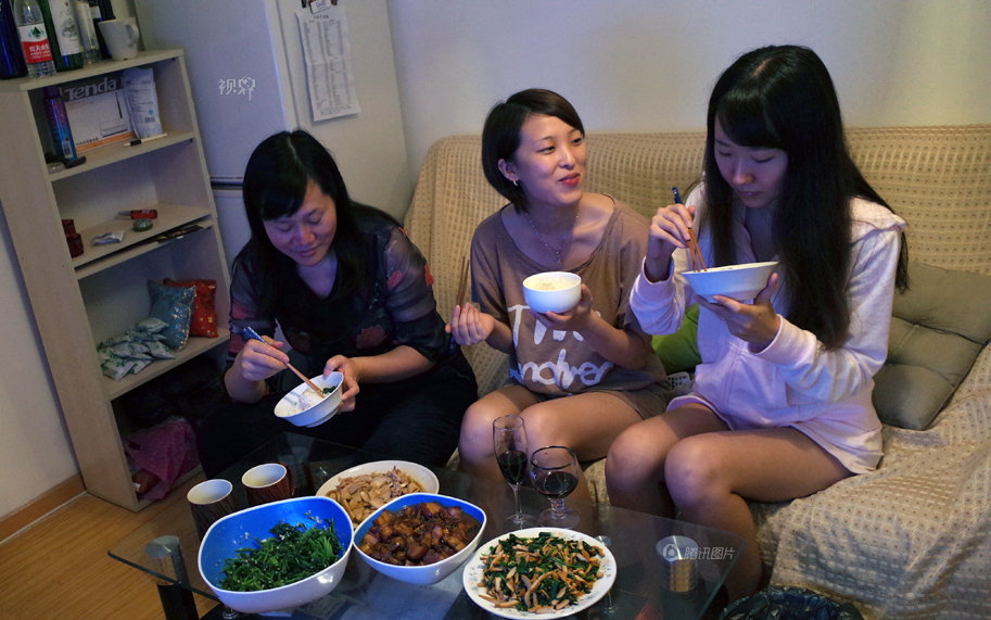 北京一所出租房,满佳欣(中)和岳浩(右),还有小满的阿姨(左),晚餐是阿姨专程从自己家过来做的,有红烧肉,韭菜香干,凉拌菠菜,蘑菇炒肉,红酒。两位女生今年刚从北京语言大学本科毕业,目前分别在公关公司和时尚杂志工作。她们平时工作忙,也不太会做饭,所以很少在家吃。老家在重庆的满佳欣自从来北京上学后就没有和家人过过中秋了,今年总算吃上了家人做的饭。