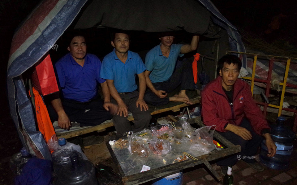 北京一小区内,自来水公司的师傅们在路边的帐篷里,这顿晚餐放在一个水桶和木板搭起的简易“餐桌”上,包括烧烤、凉菜和一些简单的炒菜。因最近在进行自来水管道除锈工程,师傅们需轮流值班看守设备;在值班期间,他们只能住在路边临时搭建的帐篷里。这四位师傅被分配中秋当天值班,他们都来自河北张家口,于2010年来到北京,但是亲人都还在老家。