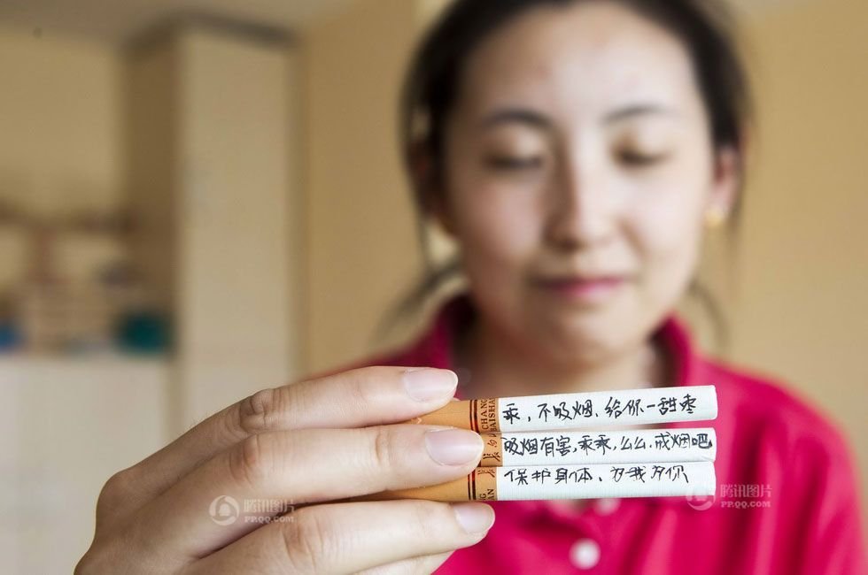 【戒烟吧】2013年8月11日,吉林女孩想男友戒烟,掏腰包为男友买烟后在烟上写字。两个月前,当一直反对男友小李抽烟的滨滨递给小李香烟后,小李感到奇怪,毕竟女友是反对自己抽烟的,当他点燃香烟后才发现,每根烟上都有女友的一句话,有浪漫、有警示……