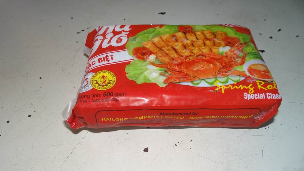这是越南春卷,10元一包,内有10条装和15条装两种。侨港人吃春卷有两种吃法:一是蒸,二是油爆。通常佐以生菜、鱼露、糖醋一起吃。