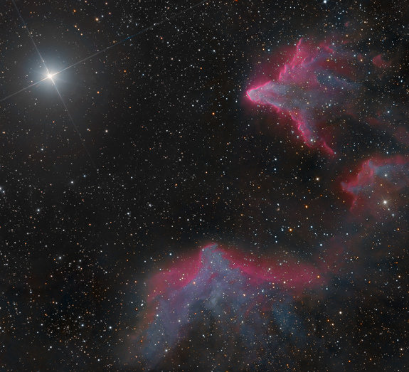摄影师Bob 和Janice在大峡谷国家公园拍摄到IC 59和IC63星云的照片,这两个星云比较容易辨别,其外观呈现出W形状,也比较明亮,其中存在着一些年轻的恒星,照亮了周围的星云。