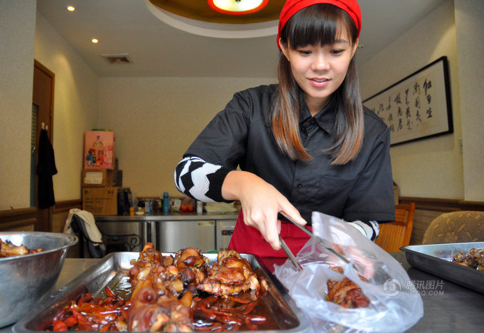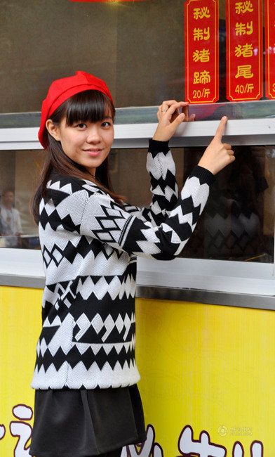 2013年10月22日,河南省漯河市,谷记秘制猪蹄店美女店主李佩煜。李佩煜今年7月1日刚从西安工程大学艺术设计专业毕业,7月12日就在漯河市泰山路北段开起了自己的卤肉店。李佩煜是个时尚的女孩,人长灵秀,她独立创业,引起网络轰动,被誉为“猪蹄西施”。