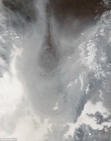 其它没有云层的区域呈现灰褐色,一些街道社区空中细微粒物指数PM2.5高达每立方米1000微克,相比之下,美国环境保护署的PM2.5正常空气质量指数标准为每立方米细微粒物应低于35微克。