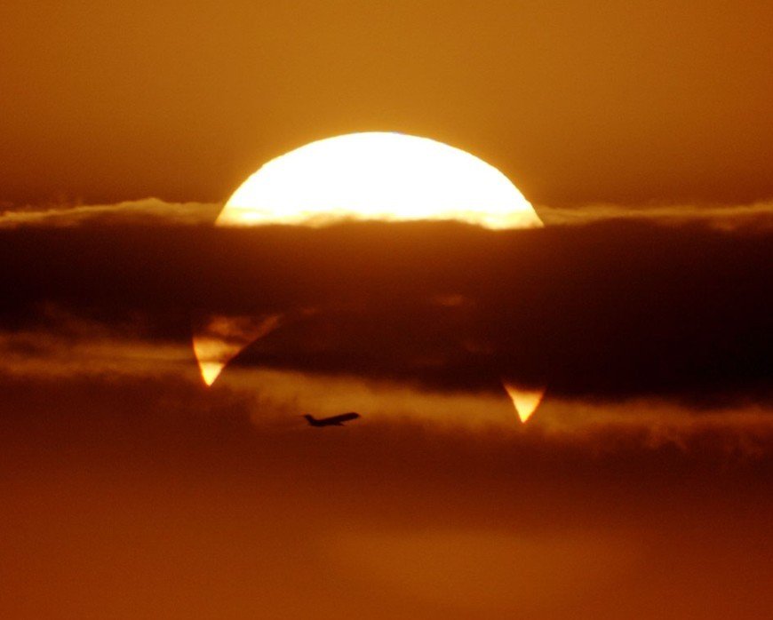 2.图中显示的是2013年5月上旬在澳大利亚拍摄到的日偏食,使用了佳能40D与佳能400毫米F5.6镜头,照片拍摄于上午07时05分,位于地平线以上1.4度左右