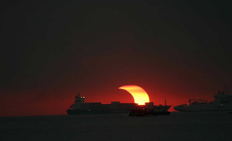 2009年1月26日在菲律宾马尼拉湾拍摄到的日食奇观,太阳像个巨大的火红镰刀,正好有一艘大型货轮驶过