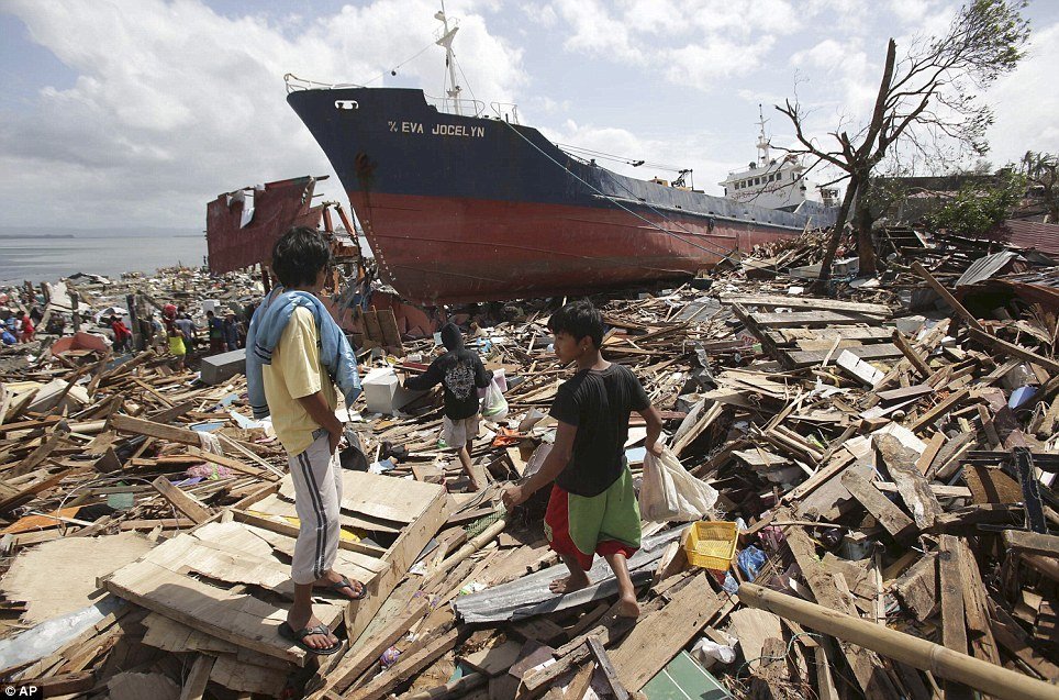 自然的力量:这只是那些被超强台风卷上塔克洛班市海岸的其中一艘轮船。