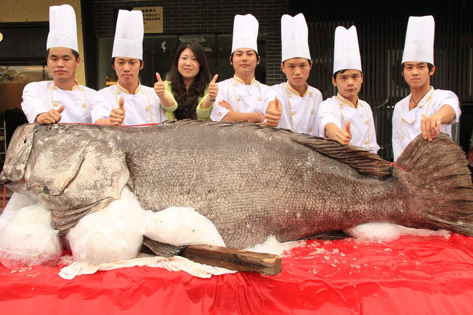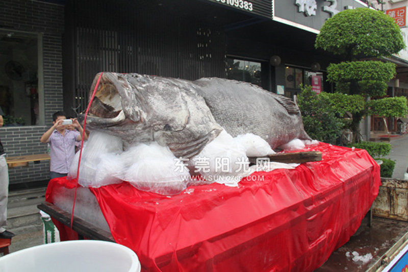 2013年11月9日下午,一条长2.65米、重683斤的巨型石斑鱼现身东莞大朗镇。这条石斑鱼嘴巴张开可以容下数条普通的石斑鱼,据巨鱼的主人林小姐介绍,这条巨鱼是本月7日渔民在南沙群岛附近海域捕捉到的。