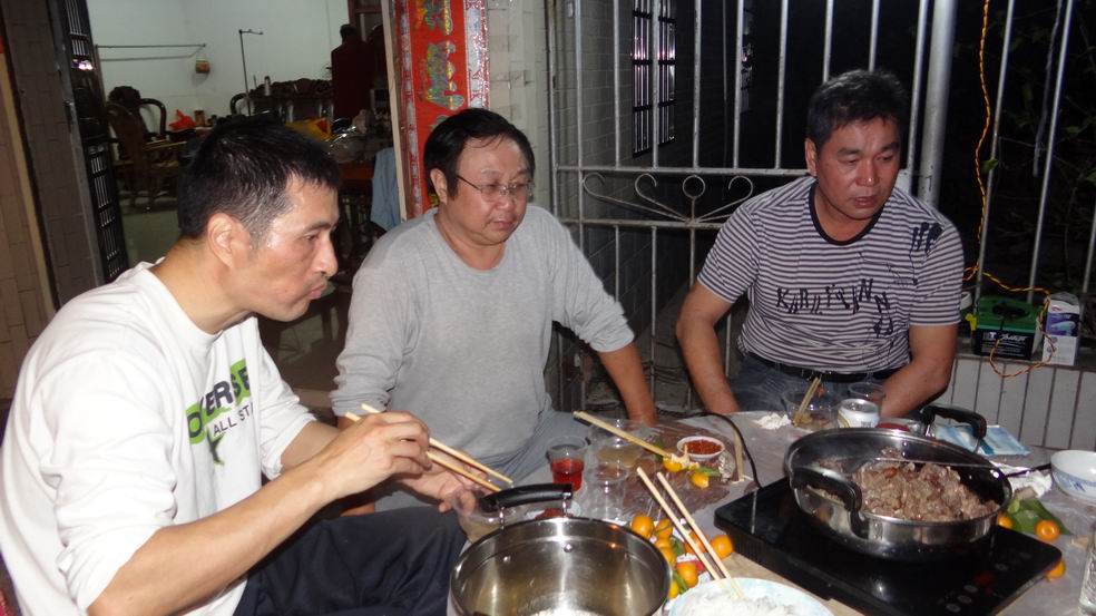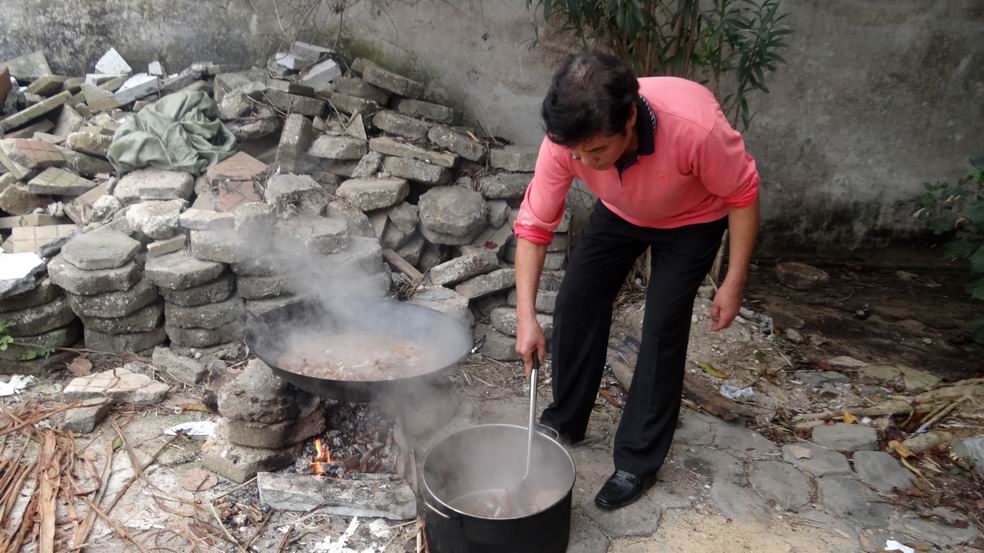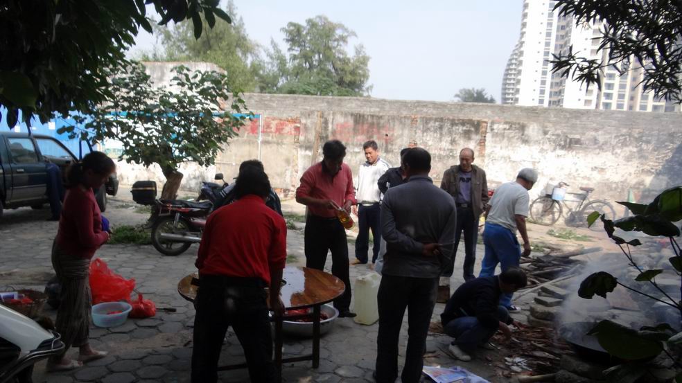 义务劳动也是队员们欢聚一堂的时间,为了在劳动后吃上一顿美味狗肉,林师傅领着一干人马早上到高德买了一条38斤重的大黄狗宰后回到摇水井冬泳基地熬,为队员们进补,立冬进补是中医说的。