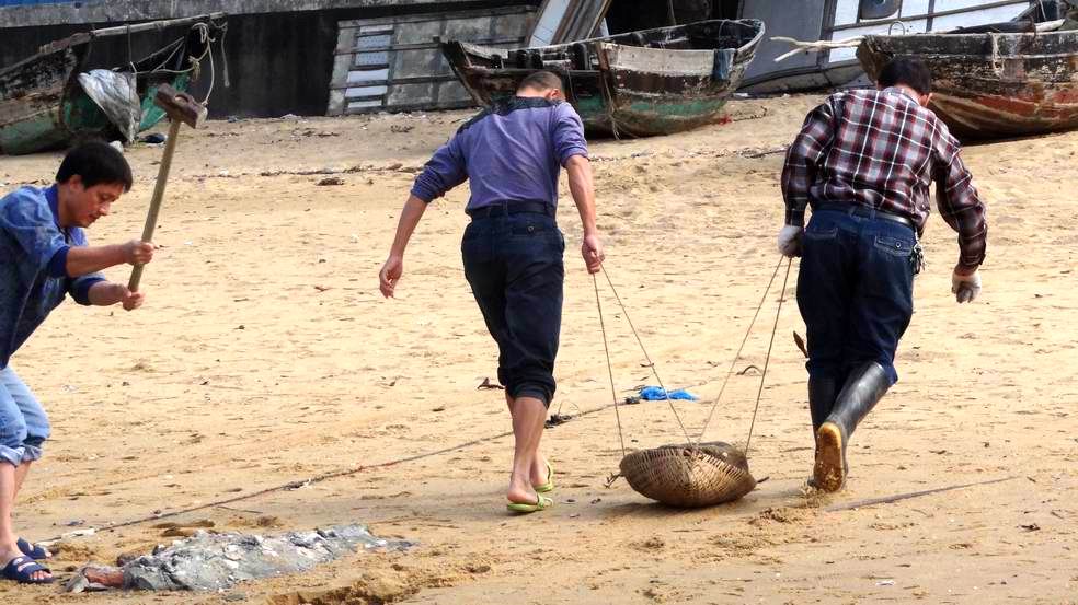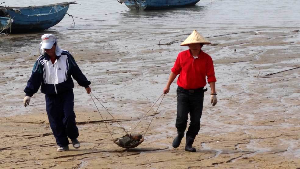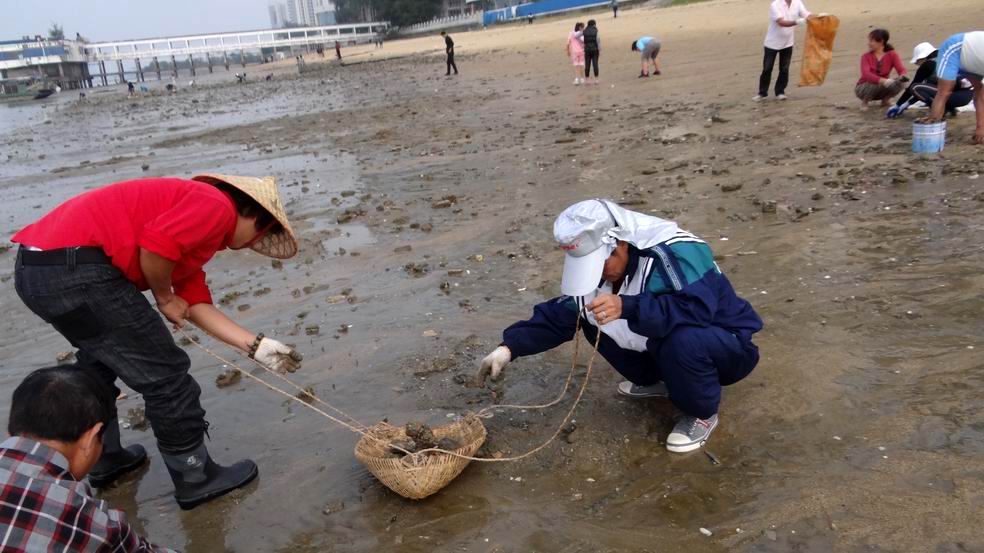 下午14点30分,队员们从家里带来箩筐、屎箕、编织袋、钢钎、铁锤等工具来到海滨公园外的海滩,队员们趁着退潮,从低潮位的水际边开始往上捡露在沙滩上的石头和垃圾,用手去挖埋在海滩下的石头,用铁锤去砸,用钢钎去撬筑在海滩上的废弃水泥墩。队员们经过2个半小时的劳动,把长150米,宽70米的海滩上的乱石和垃圾清理拉走。