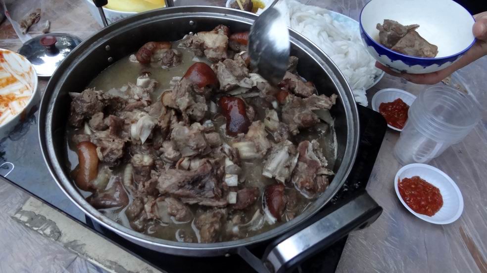 义务劳动后,队员们欢聚一堂开心吃狗肉,大补一下。