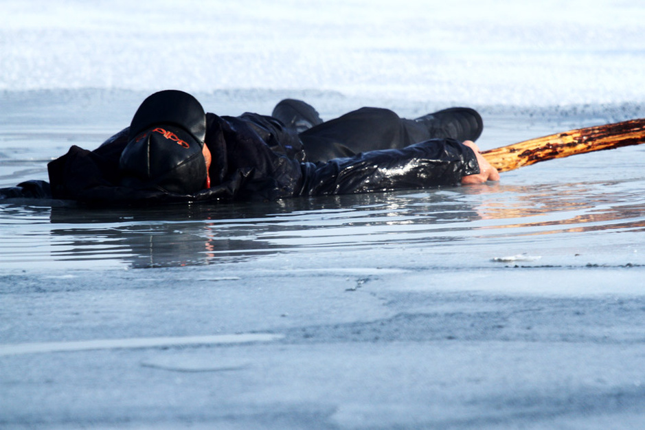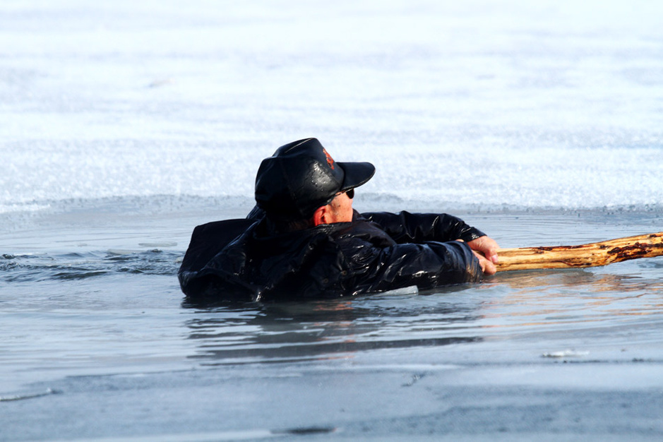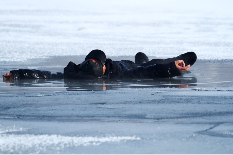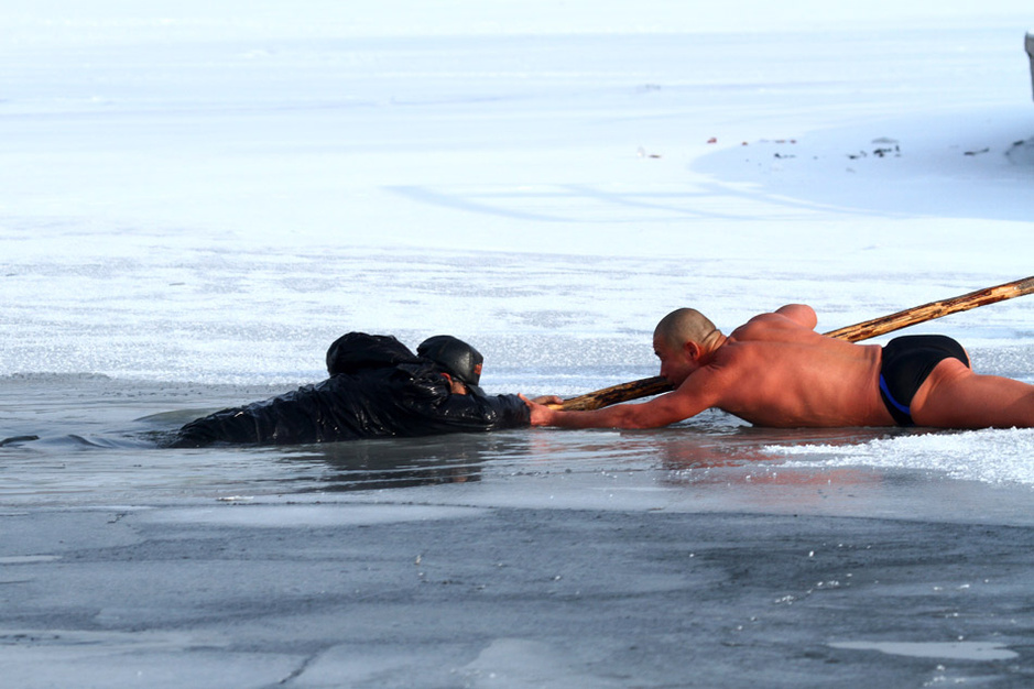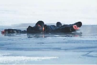 前来营救的冬泳者匍匐在冰面上,费了好大劲儿,终于抓到了被困老人的手