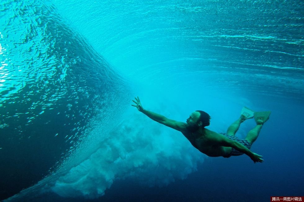 2013年12月17日报道,法属玻里尼西亚,大溪地岛,一名冲浪者在水下等待大浪。