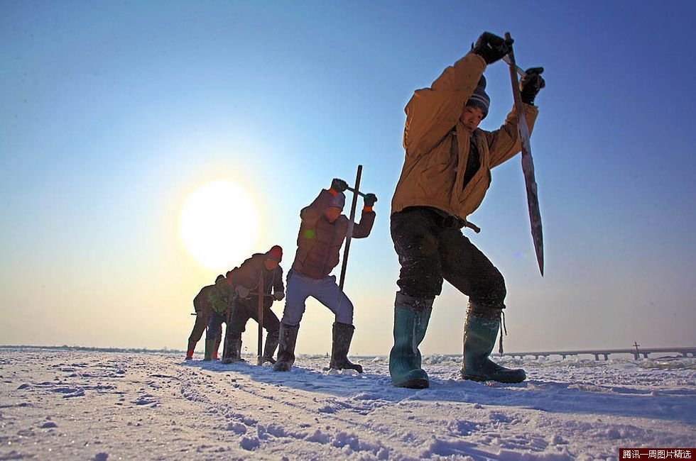 2013年12月15日,哈尔滨,松花江上的采冰人。