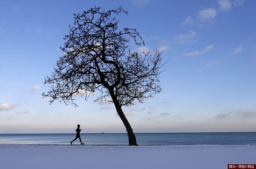 当地时间2013年12月17日,美国芝加哥,一个人沿着密歇根湖边跑步健身,当地的气温已经降至零度左右。