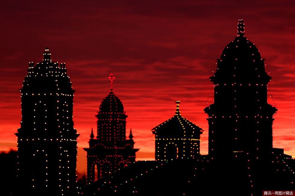 当地时间2013年12月15日,美国堪萨斯,日落时分,一家乡村购物俱乐部点亮圣诞灯饰。