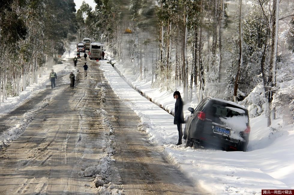2013年12月16日,云南大理洱源县,暴雪之后,一辆抛锚车等待救援。