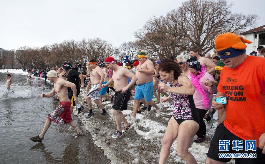 1月1日,人们冲入冰冷的安大略湖中。当日,加拿大多伦多举办2014年北极熊冬泳活动,数百名参与者在零下 ...